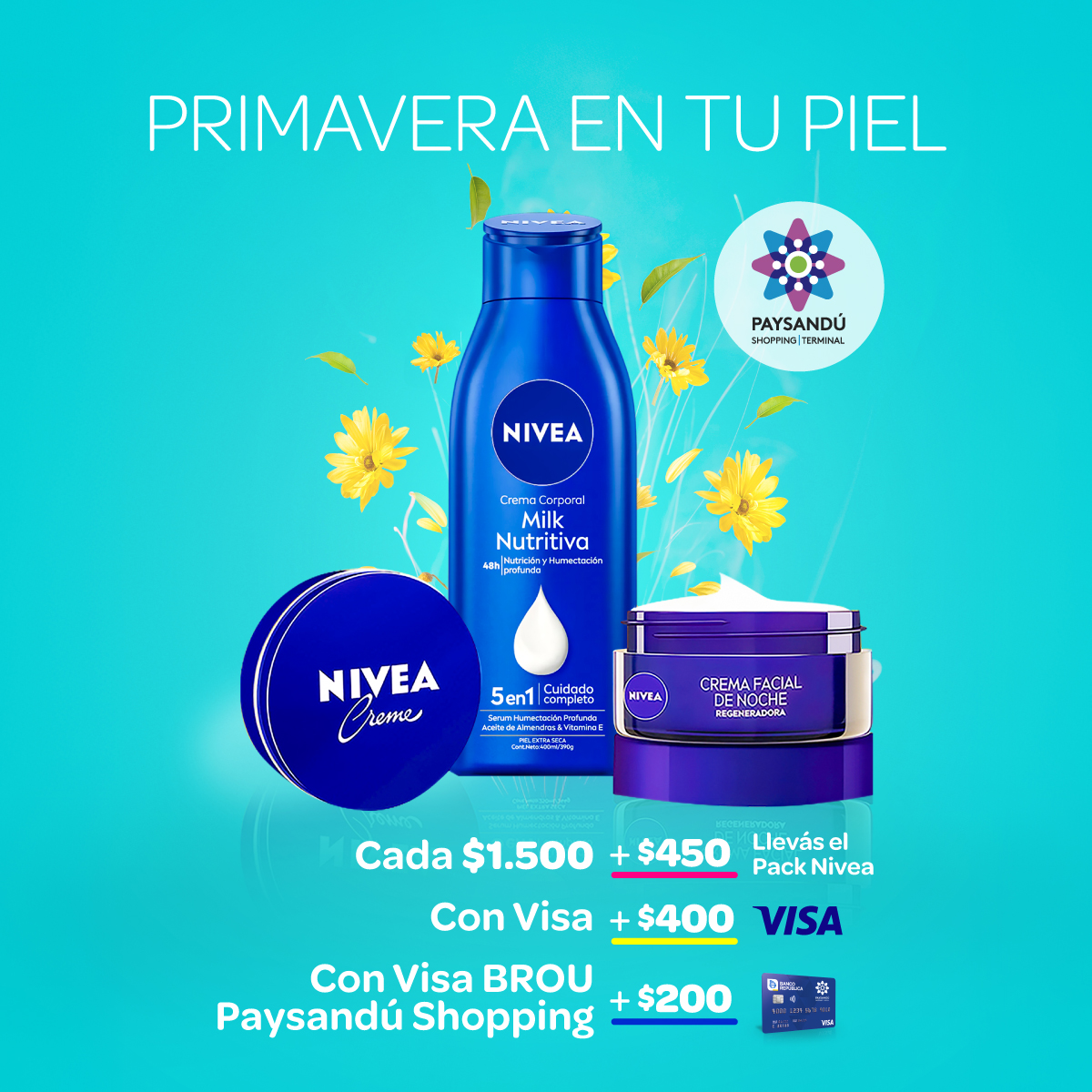 Podrán participar en la promoción “PRIMAVERA NIVEA” todas aquellas personas que realicen sus compras en Paysandú Shopping a partir del 29 de AGOSTO de 2025 y hasta agotar stock de 240 KIT NIVEA.